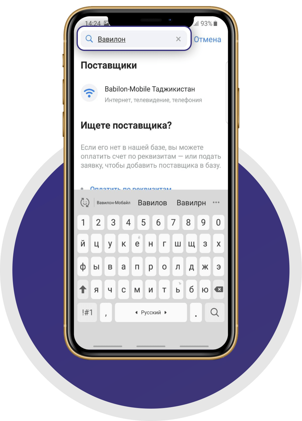 - Задать в строке поиска «Вавилон-Мобайл»