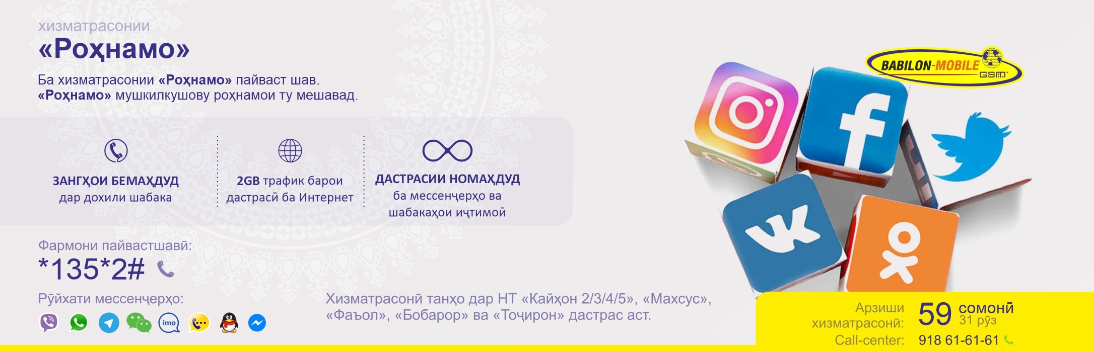 - Тафтиши ҳолат ва бақияи бастаҳо ба воситаи фармоиши *135# ва дар сомонаи http://babilon-m.tj/2001 дасрас аст.